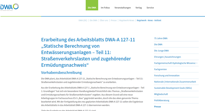 Aus diesem Grund soll eine neue Arbeitsgruppe im Fachausschuss ES-5 „Bau“ gegründet werden, in der das o.g. benannte Thema bearbeitet wird. Mit der Fertigstellung des Arbeitsblattes DWA-A 127-11 sollen die Ergebnisse dieses Arbeitsblattes in das Arbeitsblatt A 127-1 übernommen werden.