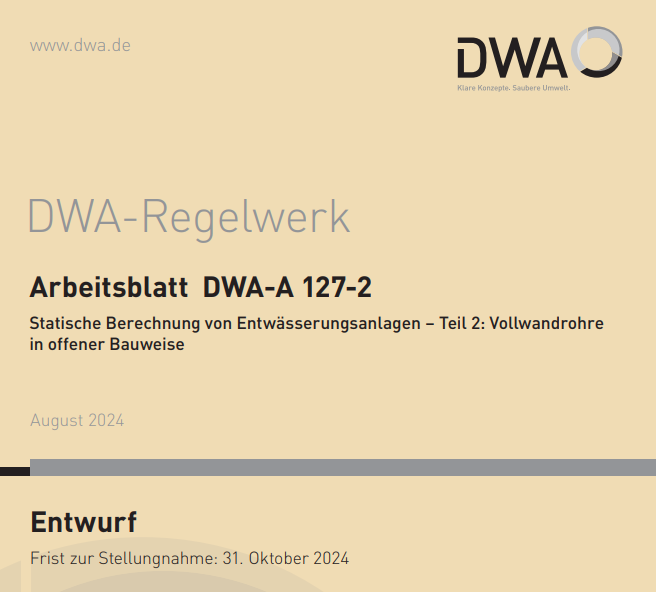 Entwurf Arbeitsblatt DWA-A 127-2 „Statische Berechnung von Entwässerungsanlagen – Teil 2: Vollwandrohre in offener Bauweise“ ► Aufruf zur…