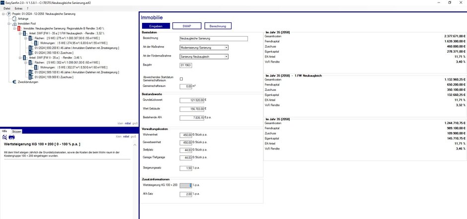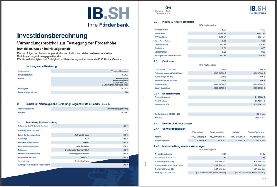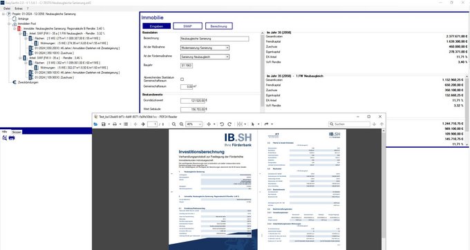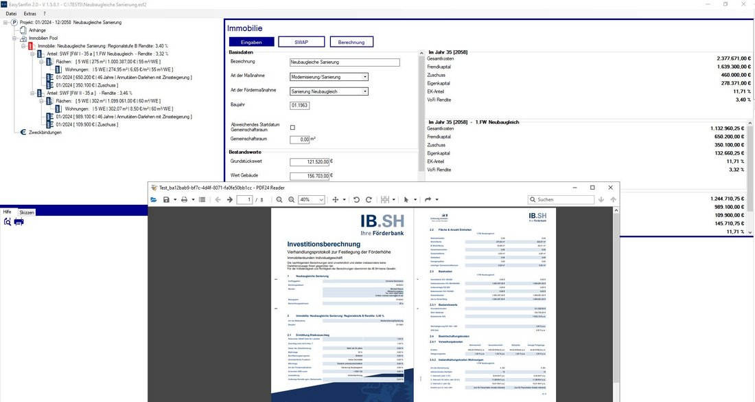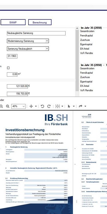 Die Investitionsbank Schleswig-Holstein benötigte auf Grundlage des Immobliensanierungs-und Investionsprogramm EasySanFin eine neue Version, die denn Schwerpunkt auf die Investitionsberechnung im Rahmen des sozialen Wohnraumförderprogramms legt. Hierbei wichtig war die Alternative Berechnung der Förderung unter Marktbedingungen, da der geförderte Bereich des Gebäudes nicht mehr Rendite erwirtschaften darf, als marktüblich.