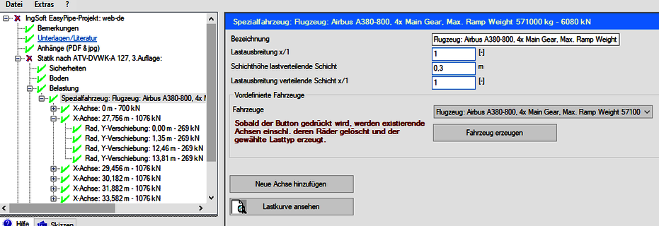 Mit ihrer Hilfe lassen sich Bodenspannungen unter Staplern, Kränen, Reach-Stackern oder Flugzeugen wie dem Airbus A 380 ermitteln. Einige Lastmodelle liefern wir direkt mit der Erweiterung aus; diese wählen Sie per Dropdown. Andere übernehmen Sie aus der Vorgabe des Bauherrn, z.B. einem Landing Gear Footprint.