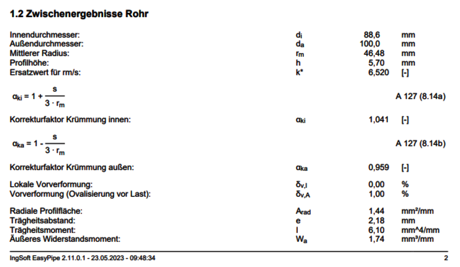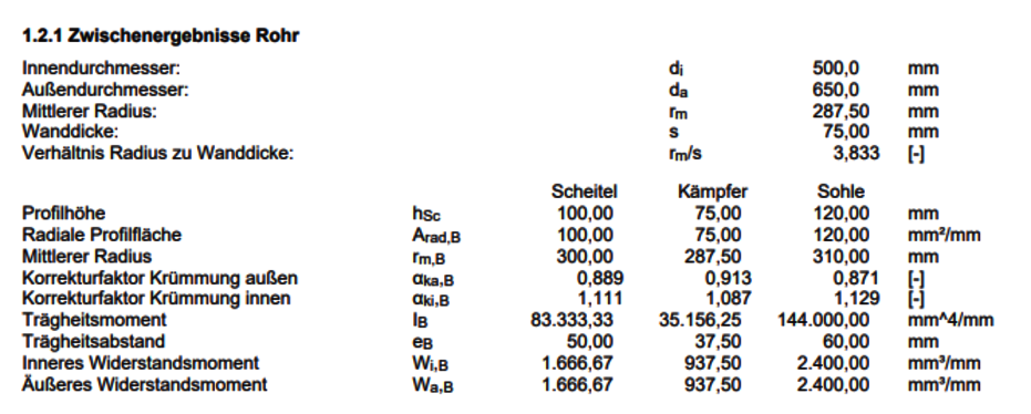 Die Berechnung erfolgt mittels Spannungsnachweis in Anlehnung an ATV-DVWK-A 127 Bild 9 für eiförmige und kreisförmige Fußrohre (DIN V 1201:2004-08). Wandstärken in Scheitel, Kämper und Sohle erfassen Sie in der Eingabemaske.