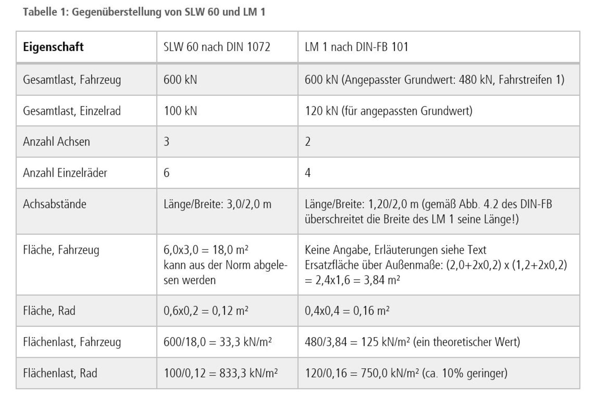 Ein Vergleich von SLW 60 und LM 1 ist nur eingeschränkt möglich, dies zeigt obige Gegenüberstellung auf. Bodenspannungen aus dem LM 1 zu ermitteln, ist mit erheblichem Mehraufwand verbunden; Handrechnungen oder einfache Kontrollen sind kaum noch durchführbar.