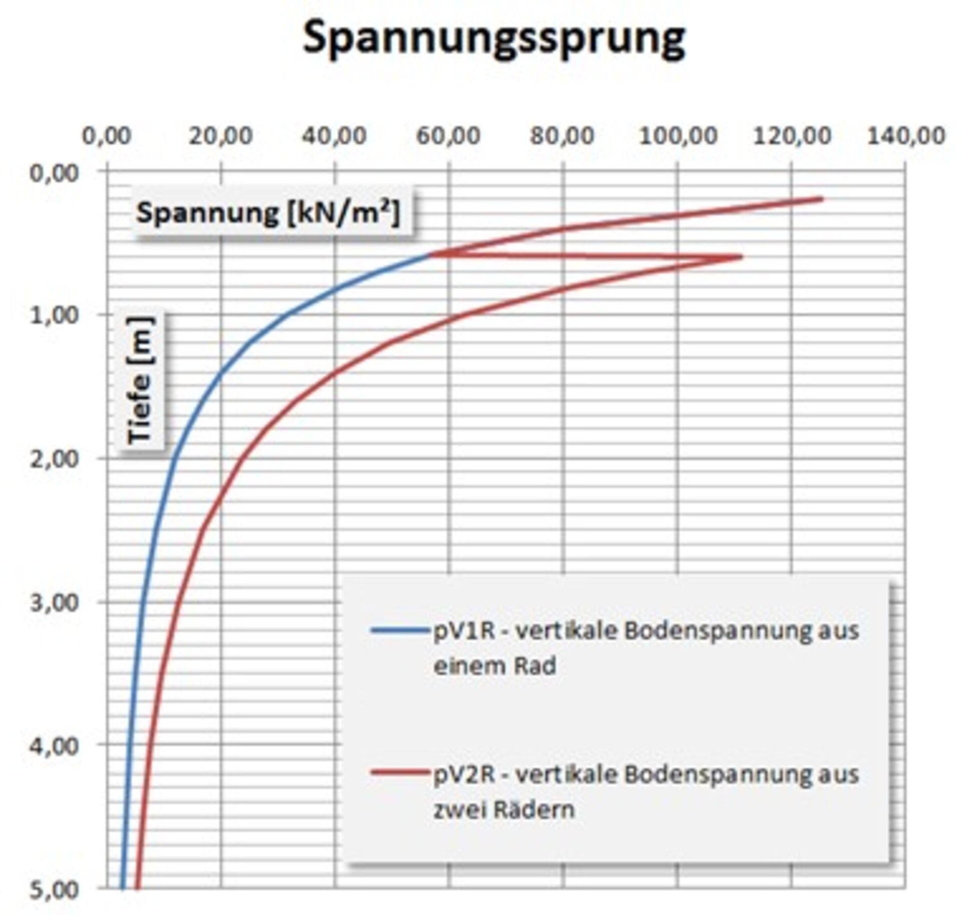 Die mit wachsender Tiefe rückläufige Einzelspannung wächst durch die Überschneidung sprunghaft an, im Falle zweier gleich hoher Einzellasten auf den doppelten Wert. Für zwei Radlasten reicht die Vorstellungskraft meist aus; werden es drei und mehr Lasten, die im Schnitt möglicherweise versetzt angeordnet sind, sind grafische Hilfsmittel erforderlich.