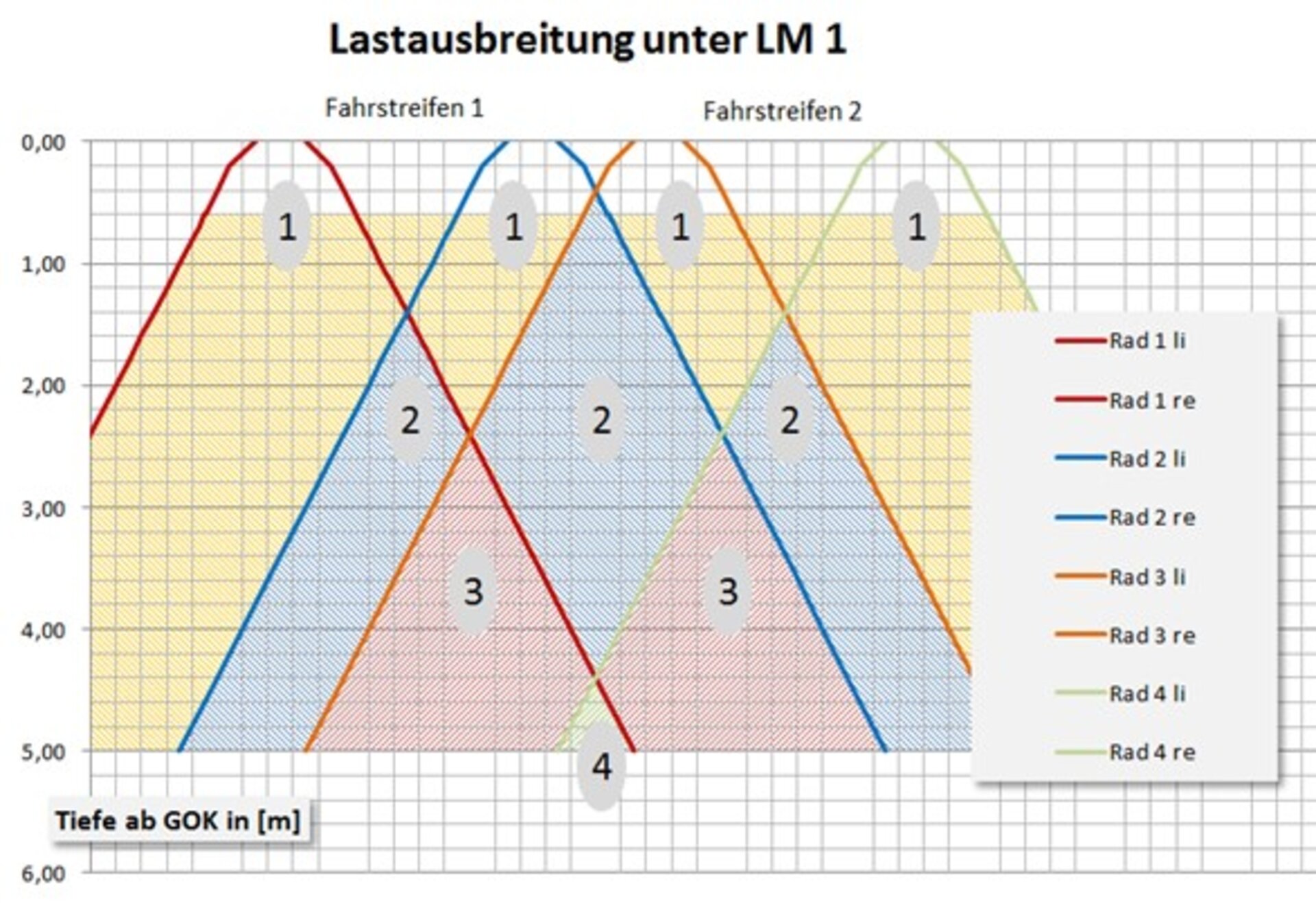Speziell im Rohrleitungs- und Schachtbau stellt die korrekte Berücksichtigung des LM 1 eine Herausforderung dar. Lastausbreitungswinkel, Überschneidungen und Tiefe (Überdeckungshöhe) haben maßgeblichen Einfluss auf die Bemessung erdüberdeckter Rohre. Grundlage ist Abbildung 2.