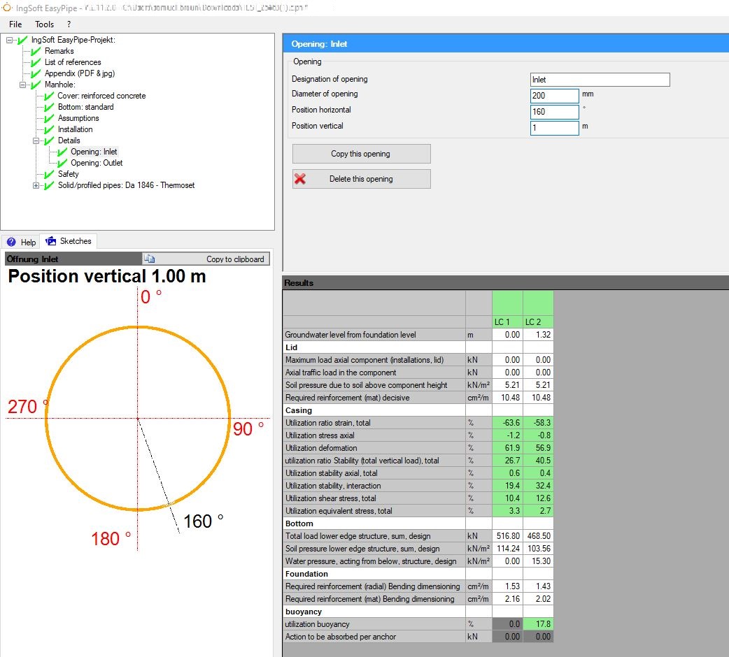 The structural analysis of an earth-embedded manhole focuses on the essential component: the manhole pipe itself. Our calculation module Manhole for IngSoft EasyPipe expands the scope and additionally measures cover plates and base plates or manhole foundations. On request, it takes into account openings and nozzles for inlets and outlets.